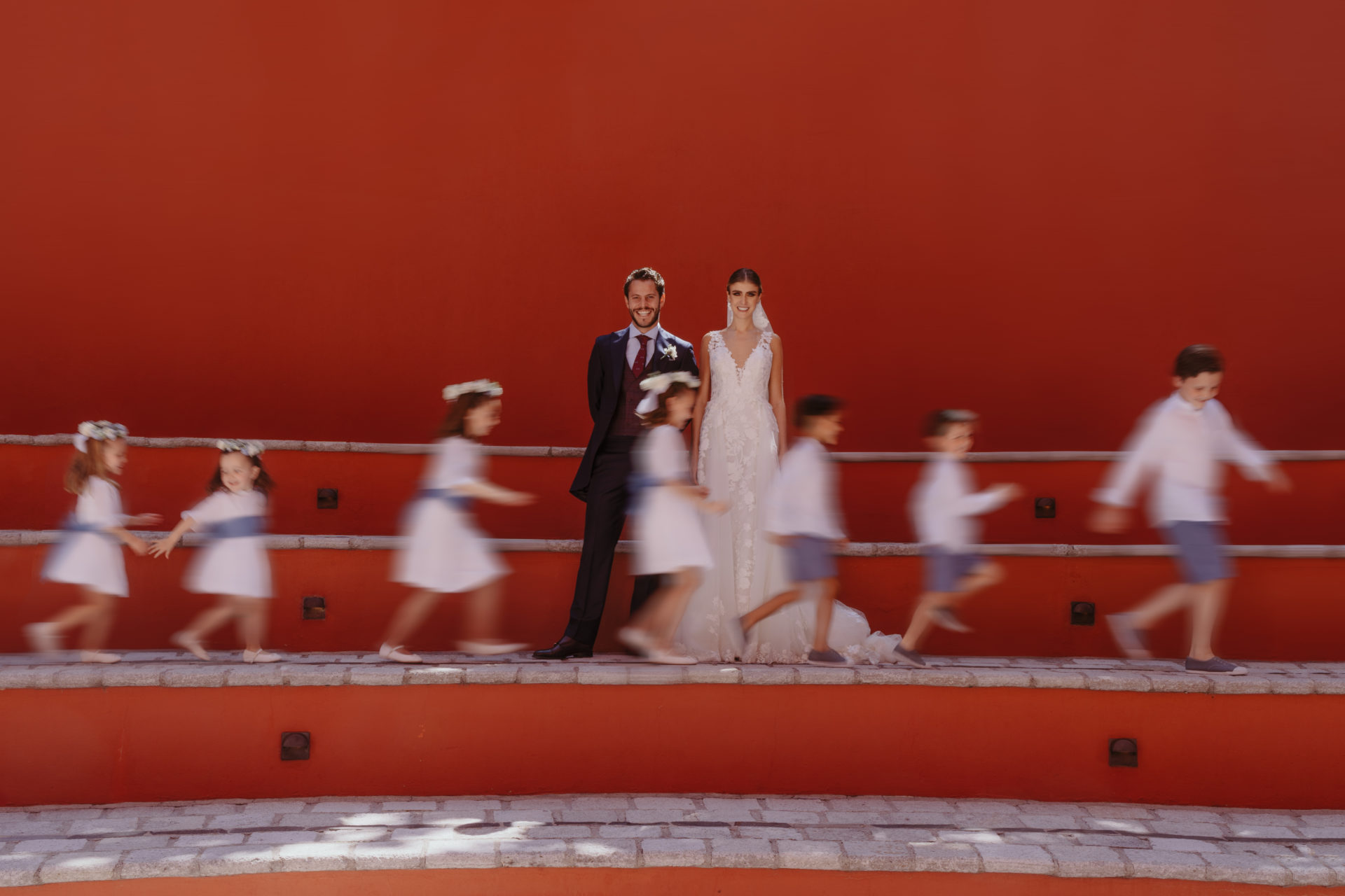 Siguiente parada: Rosewood de San Miguel, para las famosas fotos de los novios, un momento en donde solo ellos dos están. No puede faltar fotografiar a los novios entre los tonos rojizos del hotel, dandole a la foto un enfoque solo a los novios.