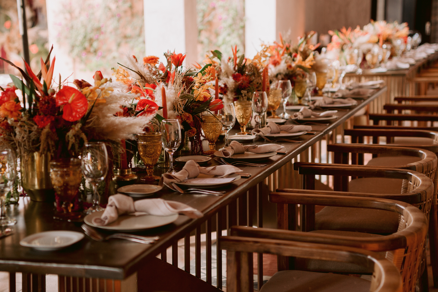 Verdaderamente fue una boda que logró tener el impacto deseado, uno espectacular. Pero algo que definitivamente atrapó nuestra mirada fue la combinación y el contraste tan perfectos que hubo tanto de la casa, como las flores y el mobiliario. ¿Cómo lograron esto? La casa de por sí sola, cuenta con flores de color lila y con un tono de pared que no es del todo blanco, lo común hubiera sido poner flores del mismo estilo, pero el equipo de PS Flower Studio, consiguió hacer el contraste perfecto utilizando flores de color naranja y beige. Por parte, el equipo de Pipe decidió utilizar una paleta de colores lo más parecida a la arquitectura de la casa utilizando tonos neutros los cuales embonaron muy bien con la casa y las flores, creando al final una armonía impecable de tonos y colores que eran del gusto y preferencia de los novios.