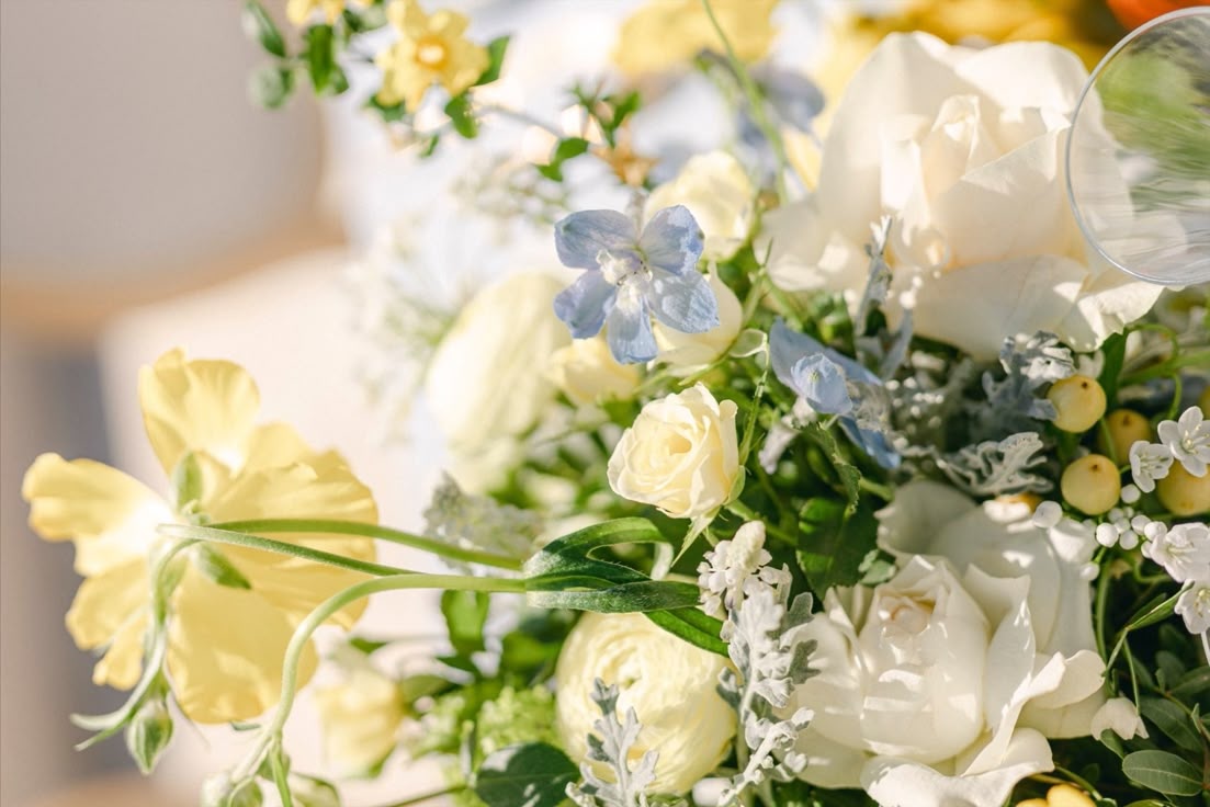 Rosas mantequilla, velas blancas, follaje fresco. Los centros de mesa serán pura poesía. El amarillo, lejos de ser estridente, teje una historia luminosa alrededor de la atmósfera romántica.