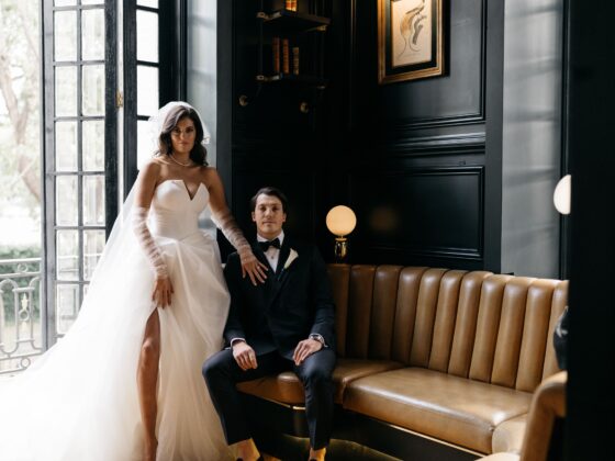 Para la recepción, la novia cambió el drama barroco por una elegancia cinematográfica. Lució un vestido columna de satén marfil, también de Westwood, con un corsé drapeado y perlas rotas cayendo como lágrimas glamorosas desde el escote. Una joya de confección asimétrica bautizada como Audrey, inspirada en la edad dorada de Hollywood. Cada hebra de perlas fue colocada a mano: la metáfora perfecta de una mujer que ha reconstruido su historia.