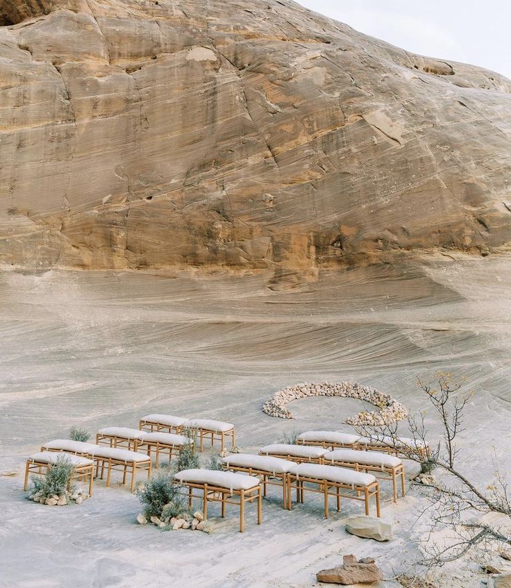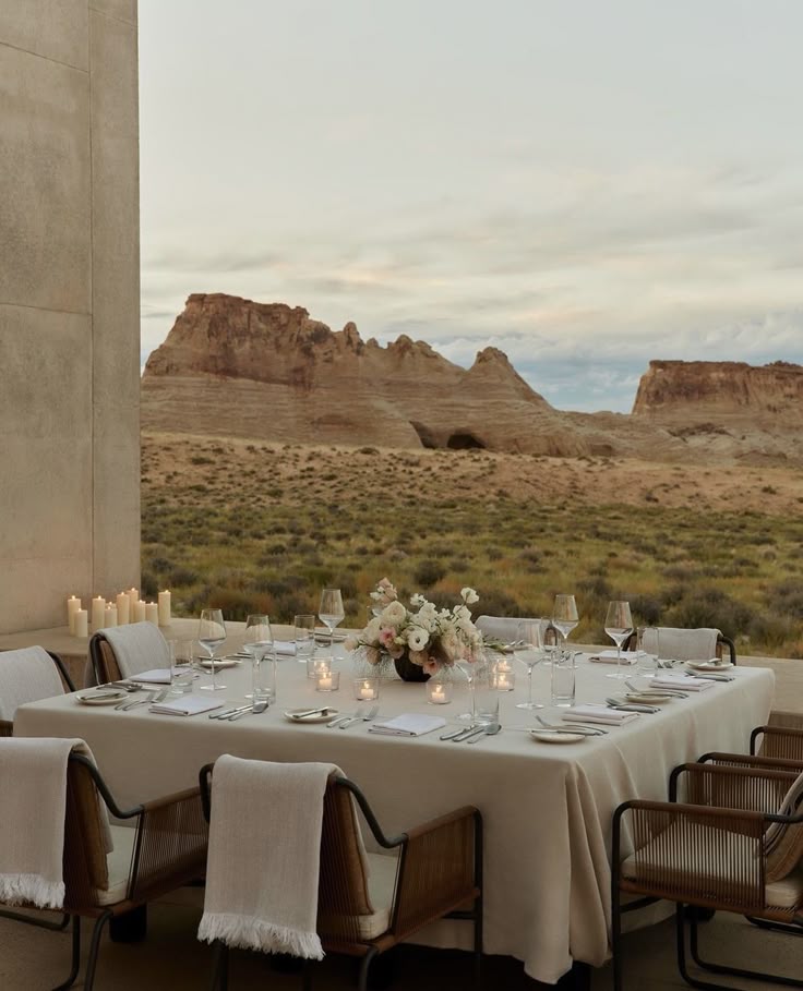 El desierto: salvaje, poético, dramático. Los tonos terracota y las montañas áridas ofrecen un fondo cinematográfico. Aquí, menos es más: un altar de madera, cojines bajos, copas de cerámica y detalles dorados.