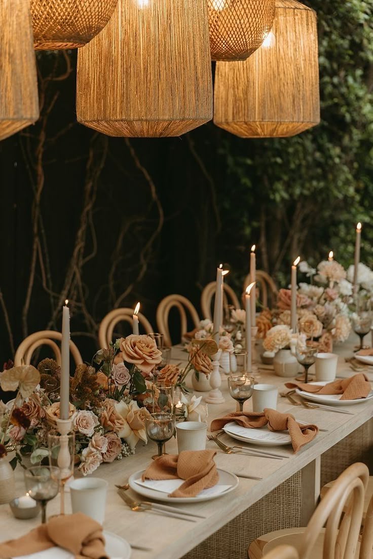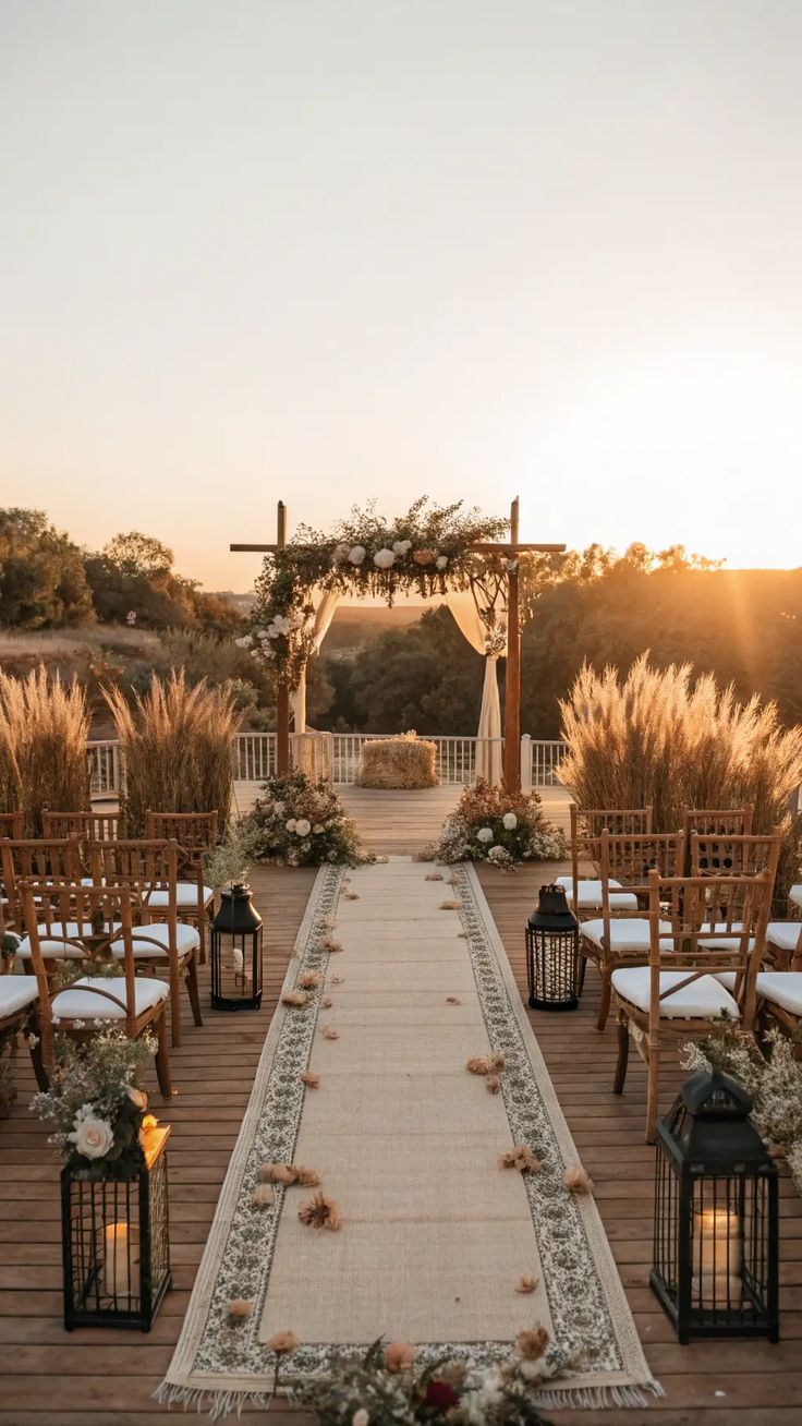 Minimalista, pero cargado de intención. Un arco de flores, textiles colgando, velas altas o lámparas de bejuco o vintage.
