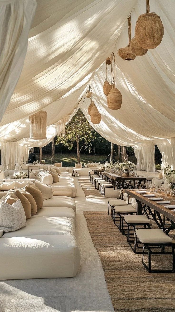 Piensa en mesas largas de madera rústica, sin mantel, solo caminos de lino natural. Sillas distintas, lámparas colgantes, copas de colores. Zonas lounge con tapetes, cojines, hamacas.
