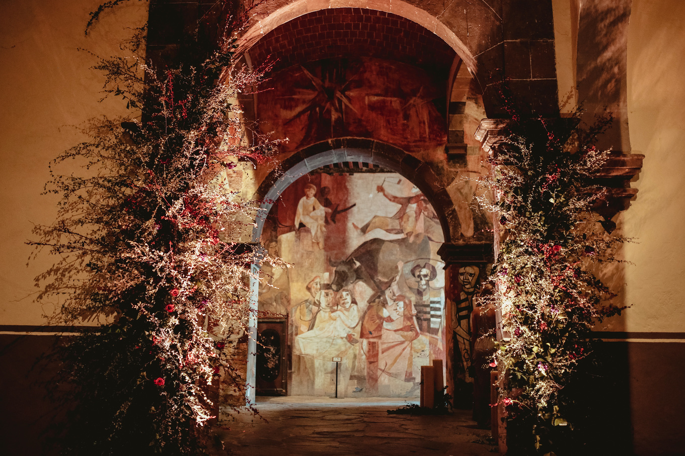 En especial tenían dos puntos focales importantes, uno era el muro llorón, donde se realizaría la ceremonia, para el cual decidieron atravesar un suspendido de lado a lado, logrando romper con la continuidad de la línea; era importante que las flores estuvieran cercanas y entre ellos.