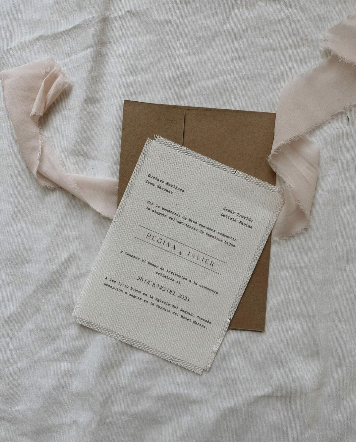 Una invitación impresa en tela es ideal para una boda fuera de lo común y para aquellos que buscan dar un detalle realmente lindo, pues también pueden incorporar técnicas de bordado que podrían complementar de manera delicada la impresión. Sin duda, son capaces de transmitir mucho a través del diseño y la fotografía.