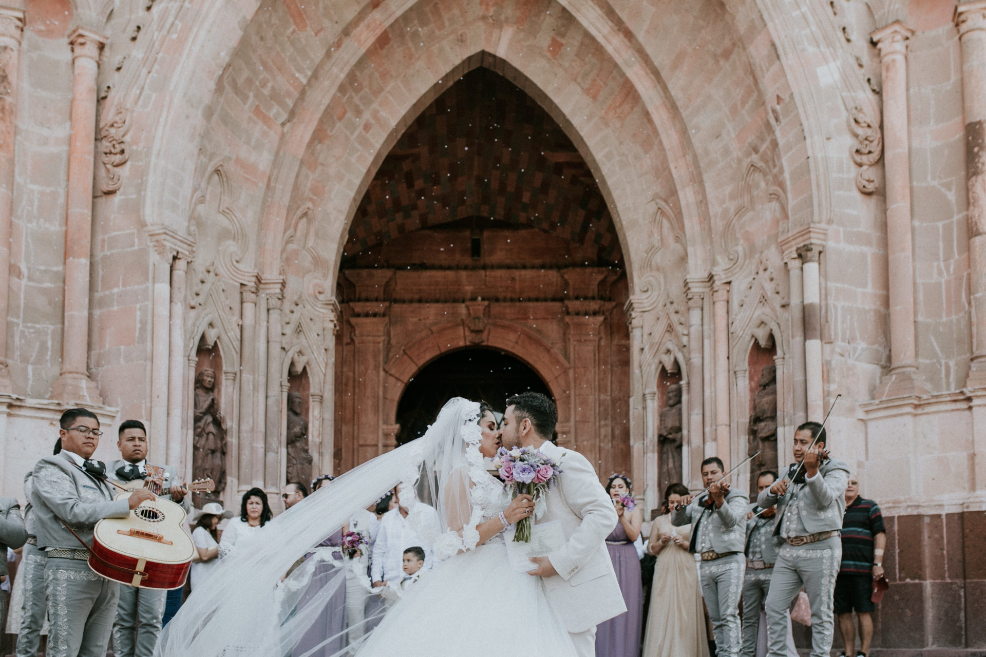 Posteriormente, fueron recibidos calurosamente por sus invitados con burbujeros y mariachi, en la entrada del templo para iniciar su tradicional callejoneada por las calles de San Miguel.
