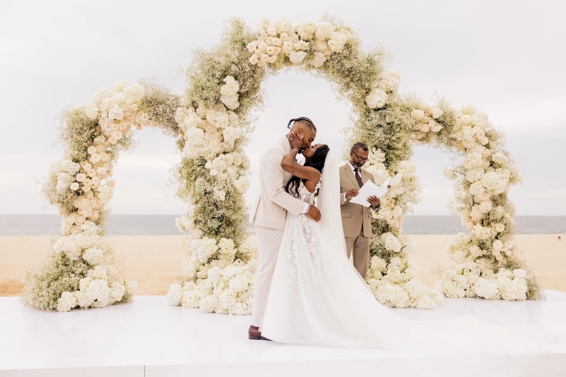 Finalmente Simone caminó hacia el altar en la Terraza Umi del Nobu Los Cabos a las 5 p.m., junto con su padre, mientras el violonchelista Andrew Savoia tocaba de fondo. Simone comenta que sentía muchos nervios, sin embargo, ver a Jonathan en el altar fue un sueño. Una ceremonia llena de amor y romanticismo.