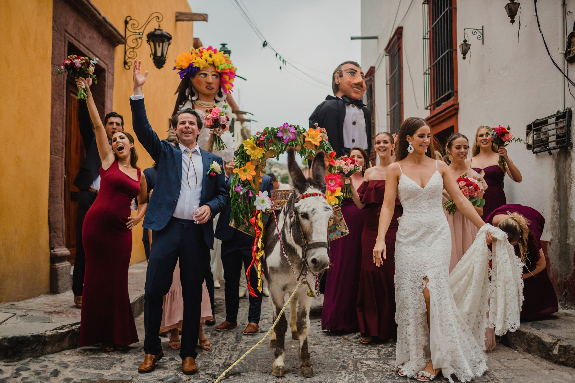We could not continue without an incredible wedding parade around the downtown, where two mojigangas danced to the sound of the mariachi, accompanying them all their way and ending at Casa Hyder, receiving everyone with a welcome cocktail around the pool.