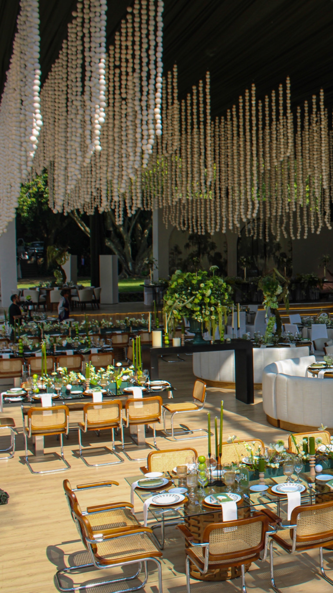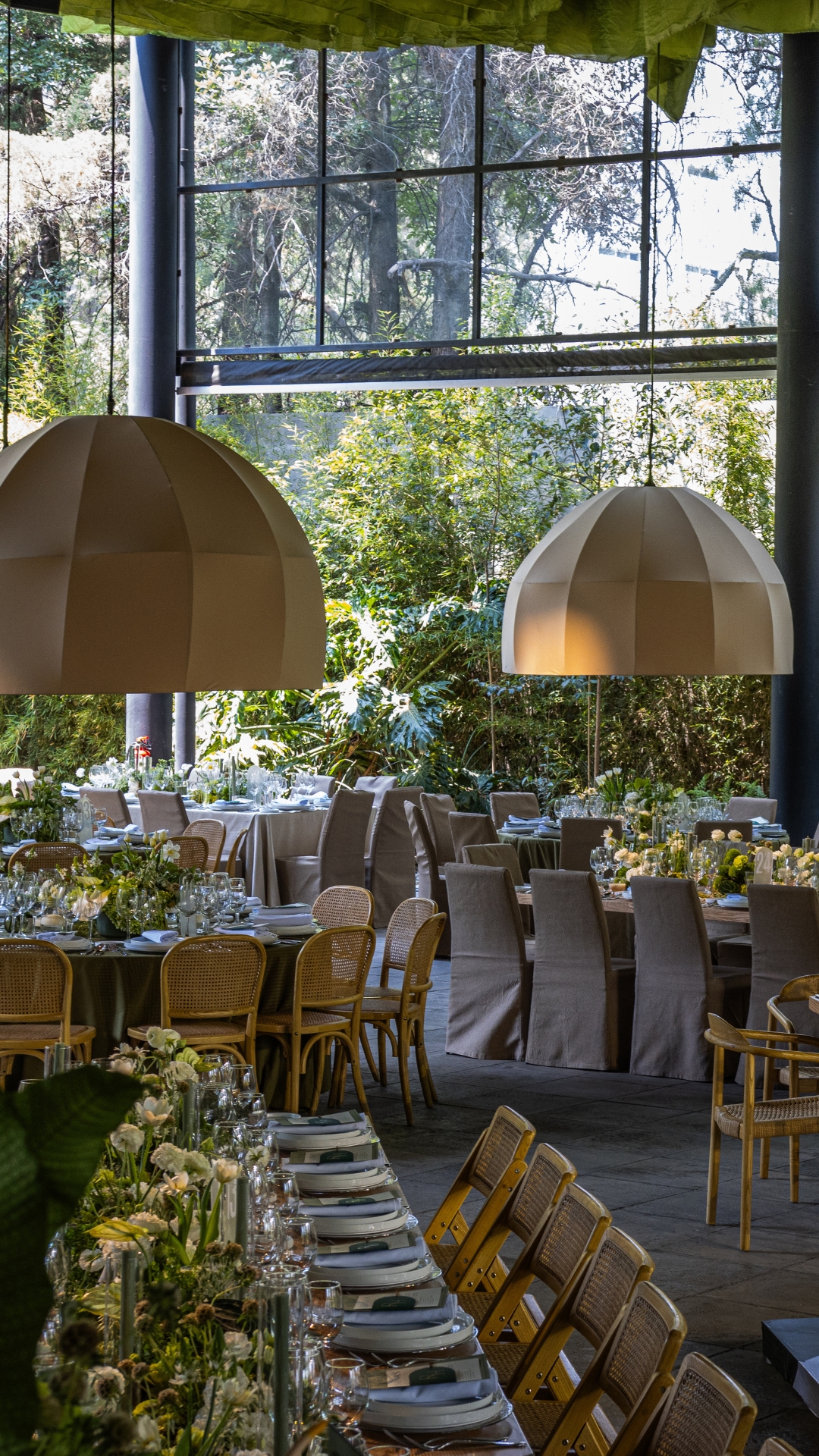 El resultado es una recepción elegante y fluida, donde las mesas se integran al espacio con naturalidad y cada elemento; flores, velas y mobiliario; sigue el mismo ritmo visual del diseño.