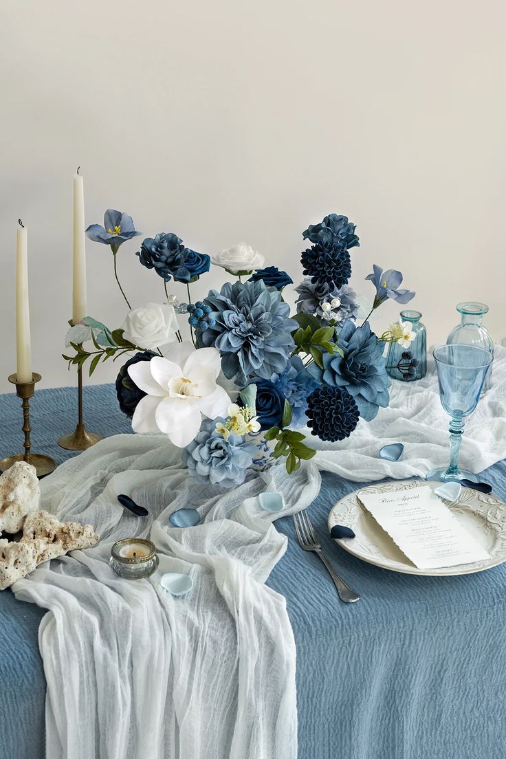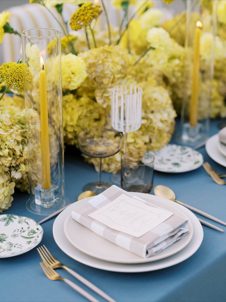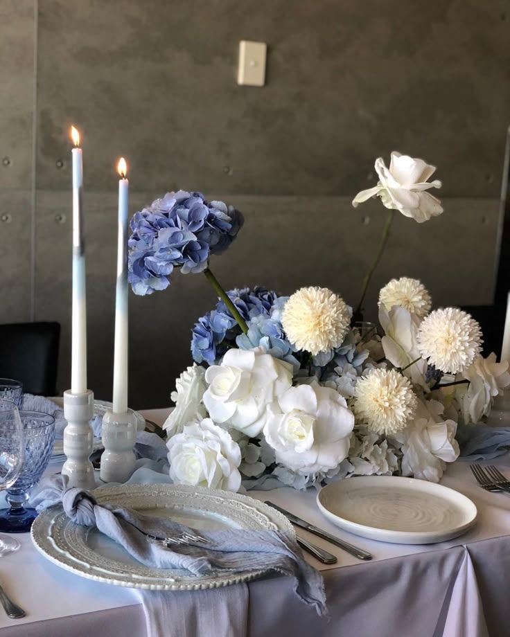 Centro de mesa: hortensias azules, eucalipto y velas blancas.