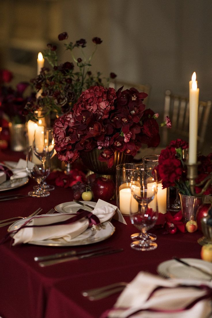 Centro de mesa: rosas oscuras, moras y cerezas en copas de cristal.