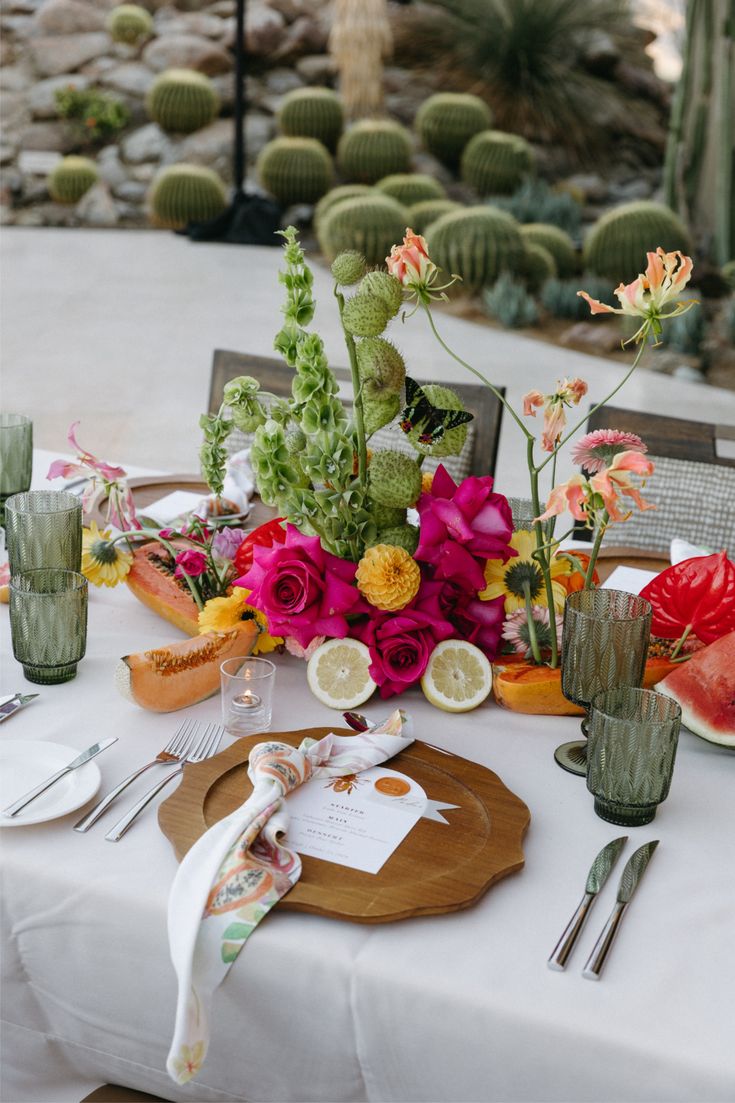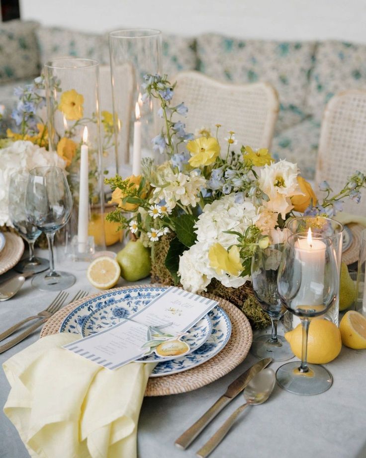 Centro de mesa: frutas frescas —higos, limones, uvas— entre flores silvestres.