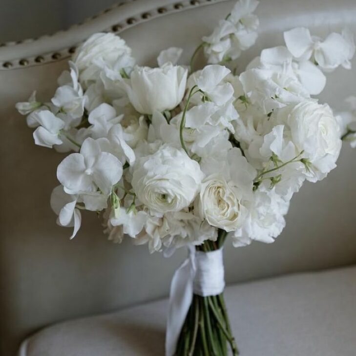 ¿Te hace match el estilo atemporal y chic? Los ramos blancos o en tonos claros con toques verdes son puro encanto. La combinación sencilla de tonos te hará brillar con elegancia.