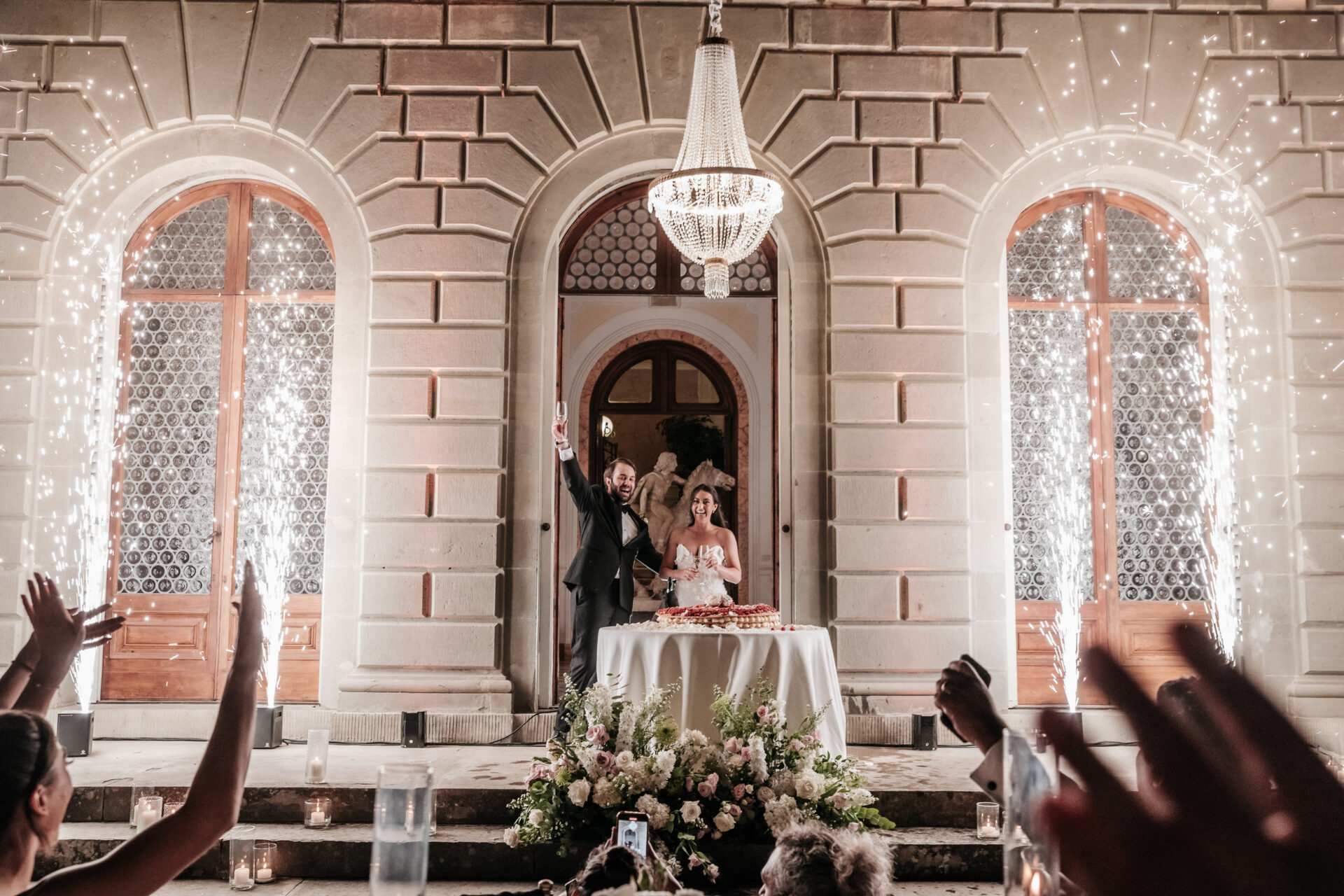 Nada representó mejor la esencia de Italia que el banquete. Desde una hora de cóctel con prosciutto fresco hasta una cena formal con platillos locales impecablemente presentados, los invitados experimentaron el auténtico sabor italiano. La noche culminó con un pastel de boda tradicional italiano, un millefoglie, preparado en vivo frente a los asistentes y acompañado de fuegos artificiales que iluminaron el cielo.