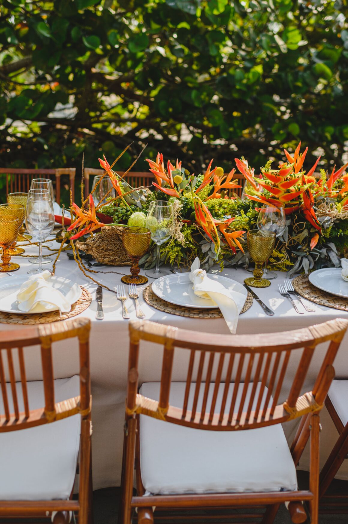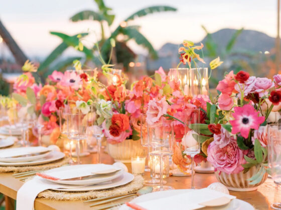 Entendemos: una vez que has llegado al paraíso, es difícil no querer pasar cada momento despierto allí. Dicho esto, aún querrás priorizar la comodidad de los invitados al seleccionar los espacios para tu celebración. Si la ceremonia va a ser al aire libre bajo la luz directa del sol, considera mover a los invitados a un patio sombreado o a un espacio con acceso interior/exterior para la hora del cóctel. A medida que el sol se pone, también lo hará la temperatura, lo que significa que puedes volver a enviar a los invitados al exterior para la cena y el baile sin preocuparte de que alguien se sobrecaliente.