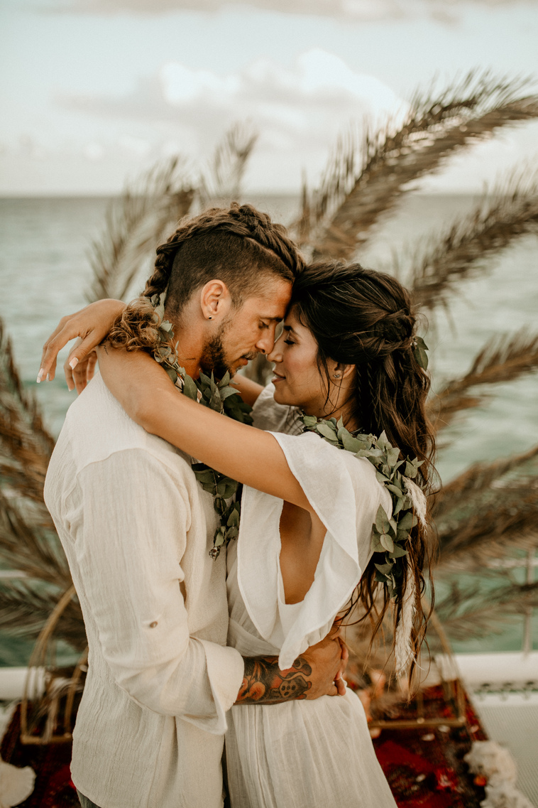 If there is something special in all this, it is not only the difference and originality of an intimate wedding, away from all the pre-planning and stress that allowed C & G to enjoy every minute of being with each other, but also reducing their budget considerably and be able to hire the wedding vendors of their dreams. From beginning to end this wedding was unique in style, no heavy or tight gowns, no ties that make breathing difficult hahaha but rather a spiritually uplifting ritual like a Mayan ceremony accompanied by a shaman after sailing from the port to a private location, where only palm trees and seagulls were witnesses.